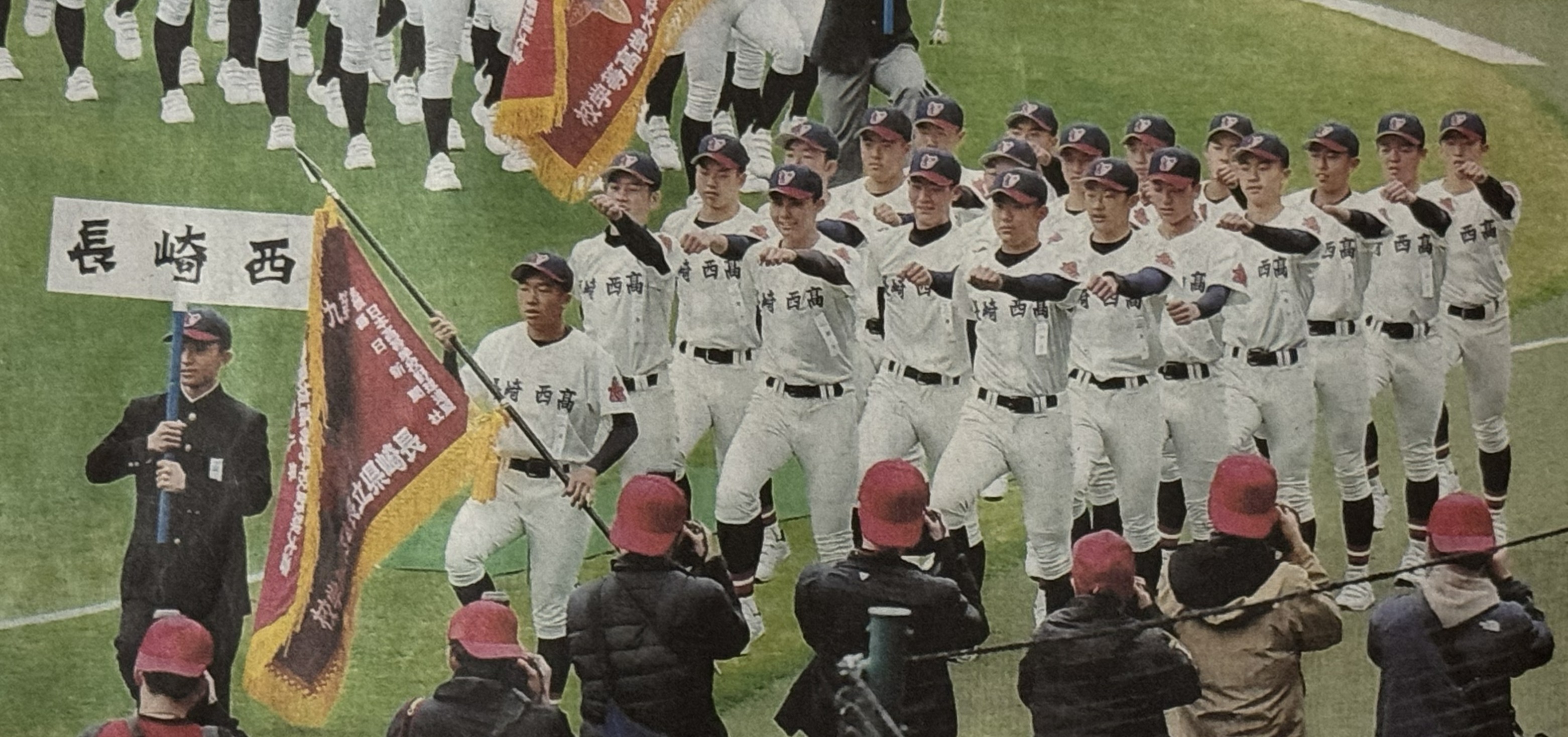 長崎西高は九州勢3番目に登場し、選抜旗を持つ桑原主将を先頭に堂々と力強く行進しました(写真①)。