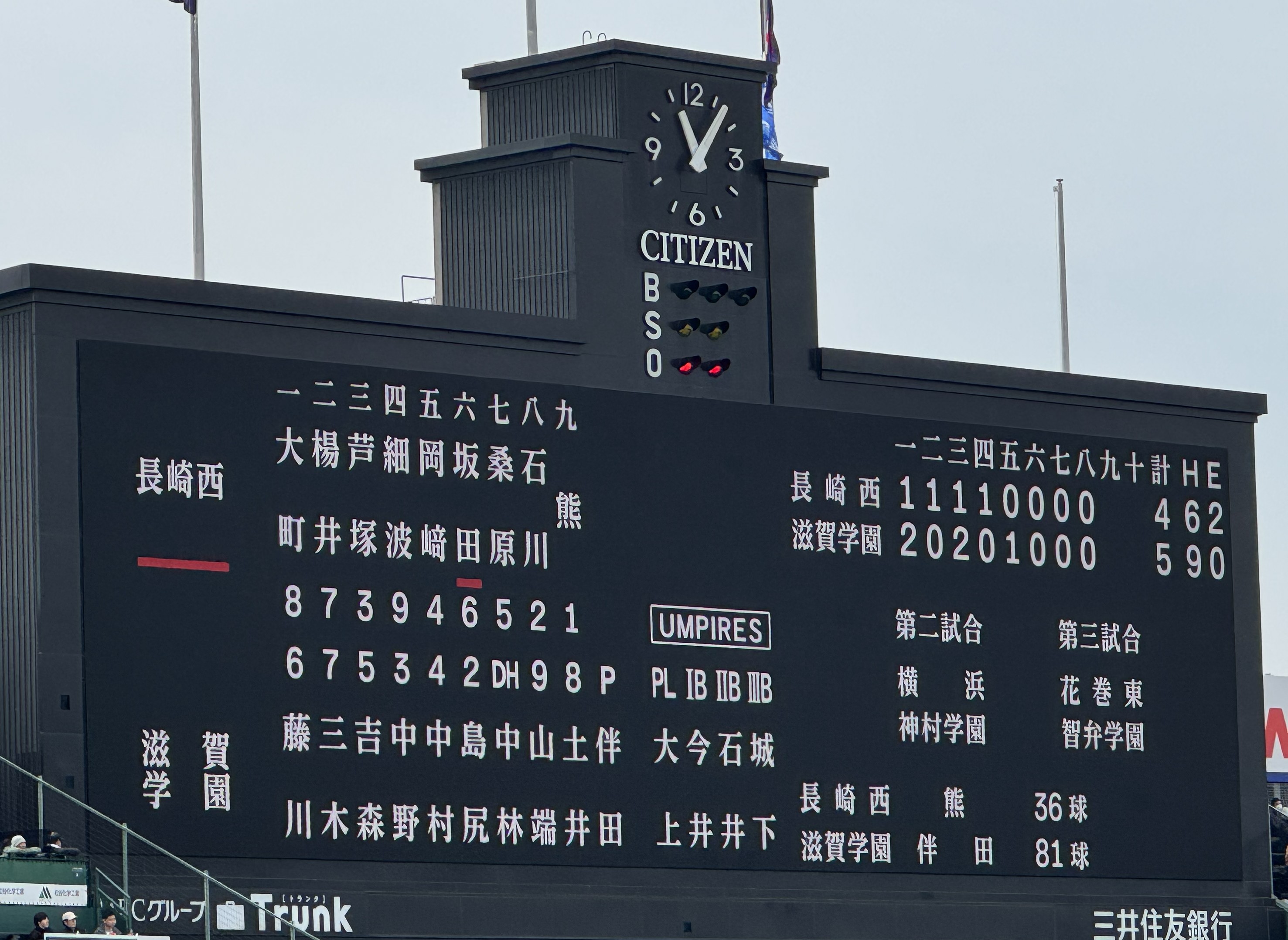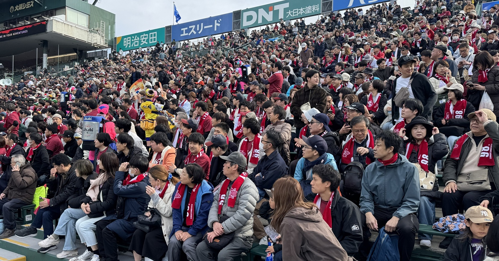 午前8時半、指定の入場口からアルプススタンドにぞろぞろと入る。スタンドの風景は 45年前とは大きく変わっていた。時計台型が特徴のメインスコアボードは最新のLEDによるカラーの全面電光掲示システムで、球種の表示はBSO、球速・球数など各種情報を得ることができる。スタンドの内装は緑色系統で統一されていて、座席の椅子はポリエチレン性の背もたれ付き一人掛けシート、アルプススタンドだけが昔と変わらぬ長椅子だ。