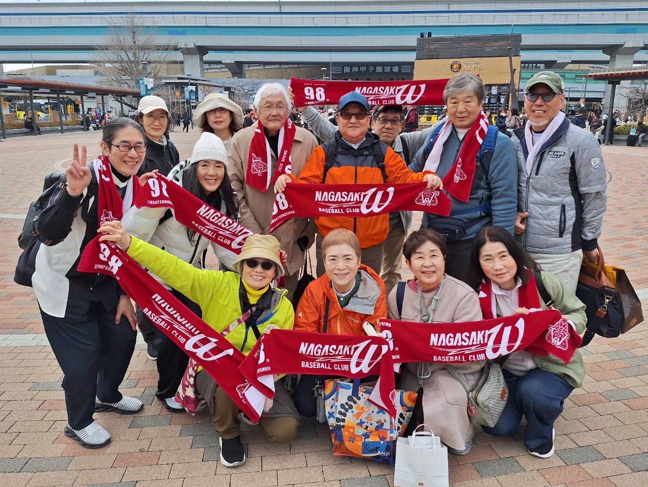 第98回選抜高校野球大会第2日、21世紀枠で選ばれた長崎西は滋賀学園と対戦、お互いに点を取り合う接戦を繰り広げたが、惜しくも4対5の1点差で敗れた。3月20日決戦の日、朝7時半、阪神甲子園駅前の高架下に設営された長崎西高関西同窓会の入場券引換受付の周りには多くの人々がたむろしていた。駅からは電車が着くたびにエンジ色のタオル(事前配布のチケットに付帯した)を首にかけた老若男女がぞろぞろ向かってくる。そしてお互いに声をかけ合うと、握手したり、肩をたたき合ったり、ハグしたり。千人を超える人々が皆、ここに一緒にいることが嬉しくてしょうがないという笑顔だ。